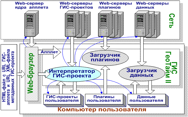 Схема сетевого взаимодействия компонентов проектируемой системы показана на Рис 1. В сети присутствуют Web-сервер ядра апплета ГеоТайм II, Web-серверы ГИС-проектов, плагинов и Web-серверы данных. На компьютере пользователя могут находиться заранее подготовлены индивидуальные ГИС-проекты пользователя, его плагины и его данные.