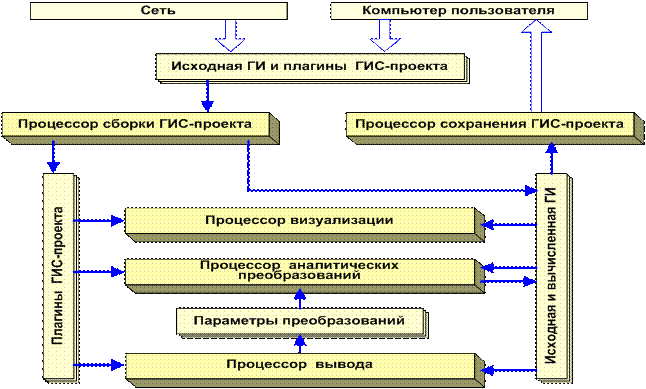 Систему ГеоТайм (рис. 2) условно можно разбить на процессоры, выполняющие операции обработки данных, и подсистему динамической памяти. Процессор сборки ГИС-проекта интерпретирует конфигурационный XML-файл метаданных проекта и обеспечивает динамическую загрузку данных и плагинов в подсистему динамической памяти клиента любой момент, пока загружено ядро апплета. Процессор сохранения ГИС-проекта обеспечивает сохранение на компьютере пользователя измененных конфигурационных файлов ГИС-проектов и новых полученных результатов.